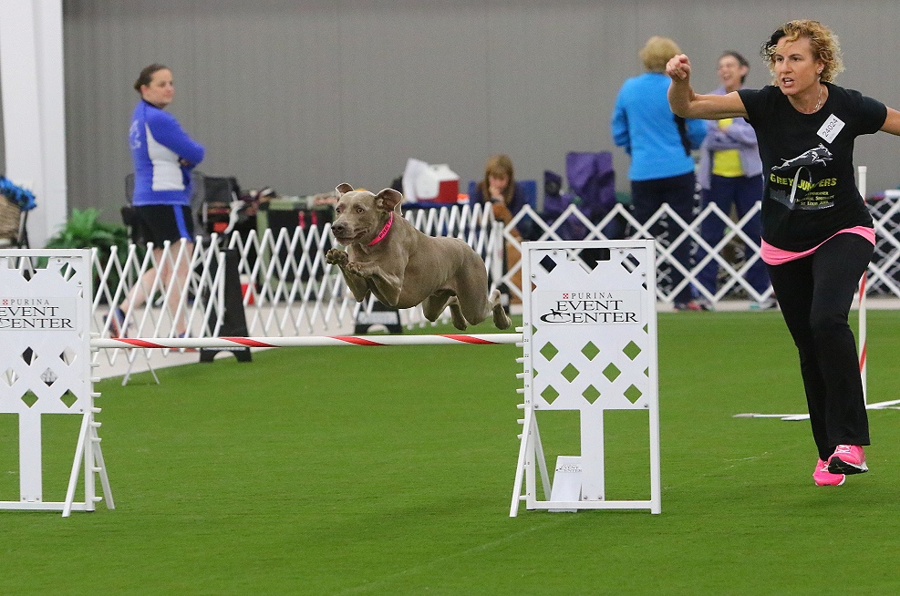"Pretzel" at Weimaraner Nationals Agility Trial in St. Louis, MO - 2015. We racked up a record number of faults in jumpers, but man did we have fun!