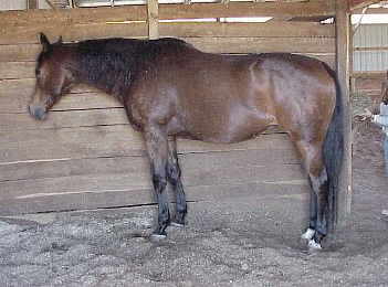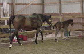 Tory began labor around 4am (after waking me up in a dream...really!!!). Unfortunately, she had quite a struggle. This foal was very large (44" at the hip), and she had a very difficult delivery. Thank goodness both mom and baby are OK after their 2 hour ordeal. 'Moe' is a bay Appendix Quarter Horse colt with one white star (perfectly heart-shaped...could he have been thinking 'Valentine's Day'?), and one small white hind sock. His sire is Shys First Leaguer, a gorgeous 16'1" bay Quarter Horse stallion who was high-point western pleasure horse in the nation in 1997, and has over 200 WP and HUS points.