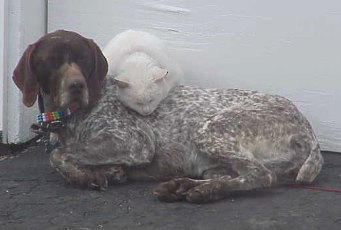 Pasta and her buddy 'Milkshake' the cat. Pasta has a deep respect for cats since Skamper raised her as a puppy and taught her the way of the world! Milkshake has no fear, she just likes a warm lap (or back!) to sleep on.